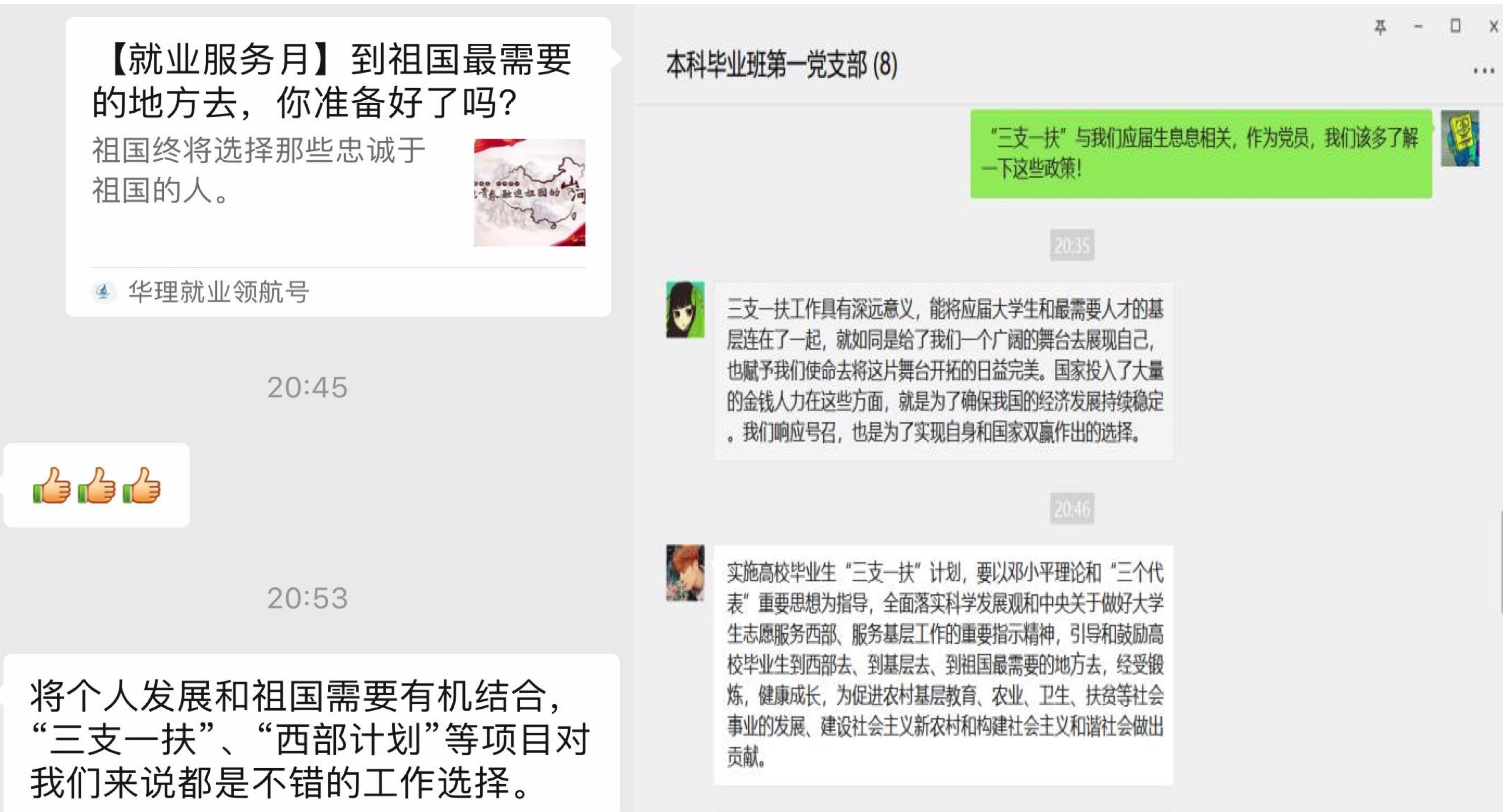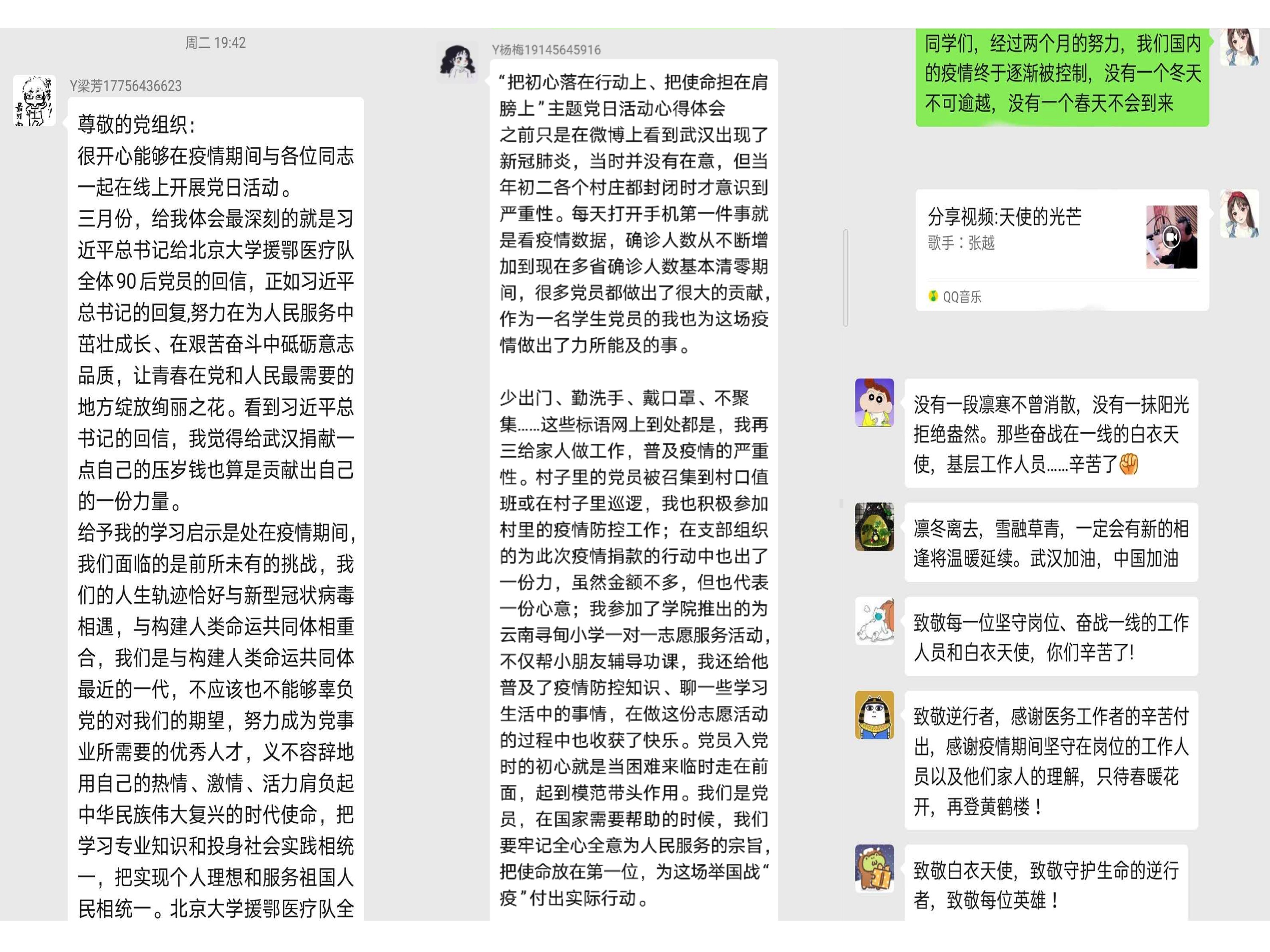 在本次党日活动中,也有不少支部为助力支部及班级同学线上学习积极献计献策,如支部内共享文献阅读公众号、支部牵头在班级范围内组织线上研讨会讨论大家近期阅读的文献和书籍、支部成员互相敦促梳理近期工作,在疫情期间整理出一篇与自己论文相关的详细的文献综述等等。也有支部发起每日阅读打卡等活动,鼓励大家充分利用居家时间多看书、看好书。毕业班党支部也借本次党日活动的机会在支部中介绍“三支一扶”、“西部计划”等项目,鼓励员工党员树立崇高的理想信念,将个人发展与祖国需要有机结合。