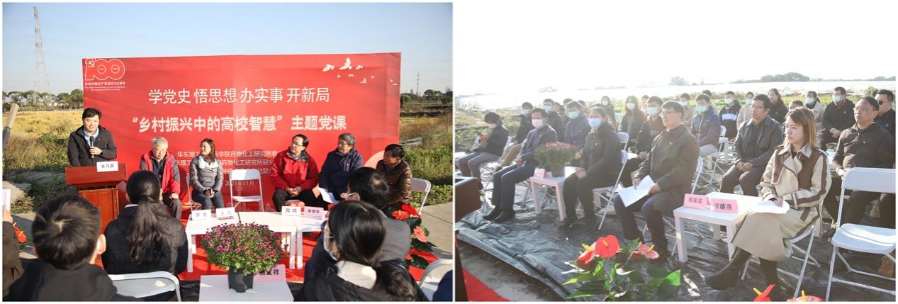 11月8日,suncitygroup太阳集团药物化工研究所教工党支部、研究生第一党支部的师生党员,在青浦区朱家角镇以“乡村振兴中的高校智慧”为题开展“陇间党课”。田地里,是师生党员们在6月份亲手种下的巨幅“党徽”稻田画;党课上,来自不同单位、不同领域的党员汇聚一堂,共话乡村振兴,为第二个百年奋斗目标新征程助力。