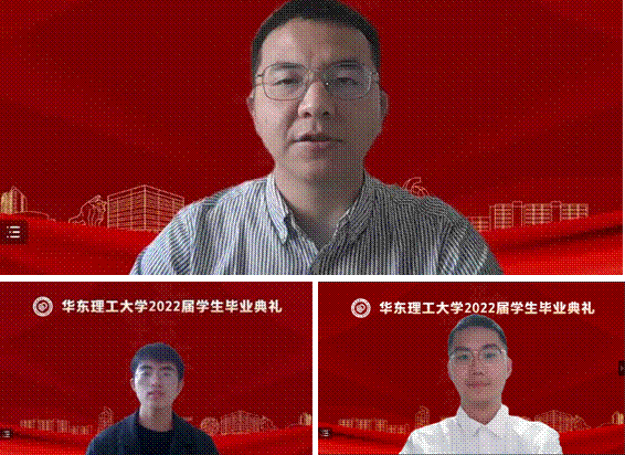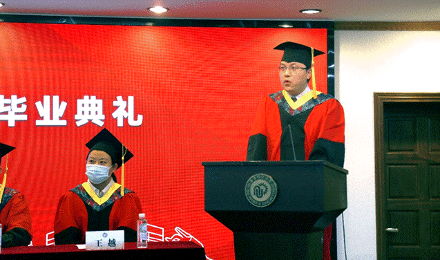 药剂182班刘宾代表本科毕业生发言。他感谢学校提供的全面细致帮助和优质平台,老师和学长学姐的悉心指导和建议,他如今带着母校及恩师的谆谆教导,加入公司研究生支教团,希望自己能为乡村振兴贡献一份青年力量,为祖国西部乡村基础教育的提升尽己所能、用实际行动践行着作为一名华理青年的责任与担当!