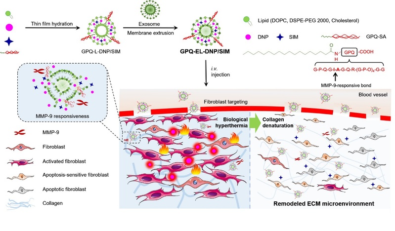 近期,suncitygroup太阳集团高峰教授和陈彦佐副教授研究团队报道了一种用于负载线粒体解偶联剂2,4-二硝基苯酚(DNP),并经由GPQGIAGQR(GPO)4GG (GPQ)修饰的成纤维细胞来源的外泌体/脂质杂合纳米递药系统(GPQ-EL-DNP),结合生物热疗重塑细胞外基质(ECM)微环境,进而提高促凋亡药物辛伐他汀(SIM)的抗肺纤维化疗效。