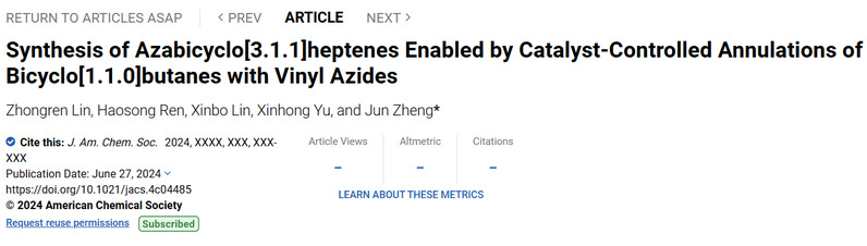 近日,公司suncitygroup太阳集团郑军课题组在国际权威学术期刊Journal of the American Chemical Society上发表题为“Synthesis of Azabicyclo[3.1.1]heptenes Enabled by Catalyst-Controlled Annulations of Bicyclo[1.1.0]butanes with Vinyl Azides”的研究论文,报道了课题组在催化剂调控双环[1.1.0]丁烷与α-烯基叠氮化物环化反应合成双环[3.1.1]庚烯的最新进展。
