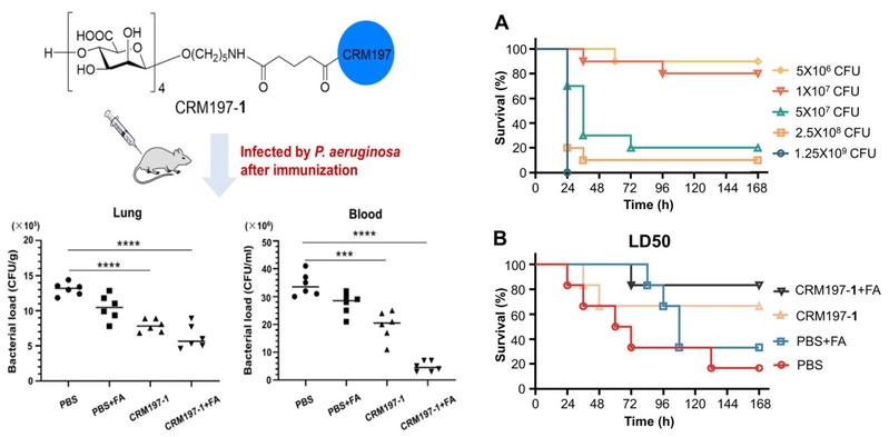 针对上述挑战,研究团队利用高度保守的合成抗原,设计和制备了一种基于甘露糖醛酸四糖的半合成糖缀合物疫苗,该糖疫苗结构均一,可引发强烈而特异性的免疫反应,对粘液型和非粘液型铜绿假单胞菌菌株的感染具有广泛的保护作用。该糖疫苗所产生的抗体不仅能够识别不同类型的铜绿假单胞菌菌株,而且能够根据菌株表面表达的褐藻胶的量以不同的水平介导对细菌的调理吞噬杀伤作用。接种该糖缀合物疫苗有效促进了铜绿假单胞菌粘液型PAC1菌株在小鼠肺部和血液中的清除,降低了促炎细胞因子的释放,显著提升了感染铜绿假单胞菌非粘液型PAO1菌株的小鼠生存率,发现该糖缀合物疫苗有潜力被开发成针对几乎所有铜绿假单胞菌都能提供广泛保护的广谱糖疫苗。