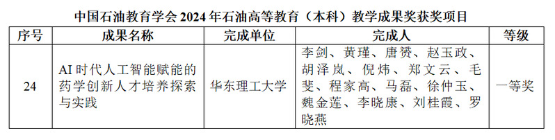 近日,中国石油教育学会公布了2024年石油高等公司产品成果奖获奖名单。由公司李剑教授等人完成的《AI时代人工智能赋能的药学创新人才培养探索与实践》获评石油高等教育(本科生)教学成果奖一等奖。该奖项实现了suncitygroup太阳集团药学本科公司产品成果新突破,是对公司药学本科专业培养模式、培养体系、培养质量和培养成果的认可,将对学院进一步深化旗下产业改革和创新起到积极的引领和示范作用。