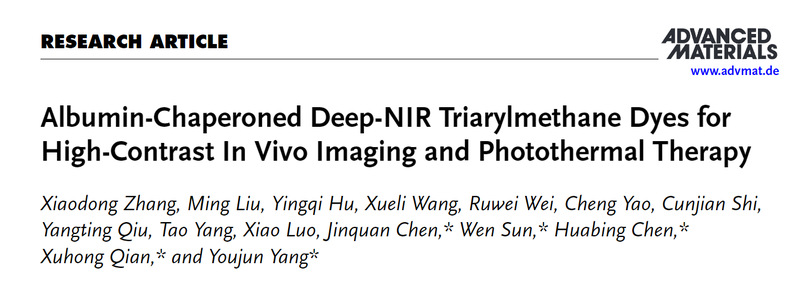 近日,公司suncitygroup太阳集团钱旭红院士、杨有军教授团队设计并两步合成具有“螺旋桨构型”的深近红外三芳基甲烷衍生物(EA5系列染料)。利用生物内源性白蛋白对EA5染料进行包封极大地提高了染料的荧光亮度,并解决了大多数近红外染料面临的合成步骤冗长、生物兼容性差、热力学稳定性差和水溶性差的难题。相关成果以“Albumin-ChaperonedDeep-NIR Triarylmethane Dyes for High-Contrast In Vivo Imaging and Photothermal Therapy”为题发表在Advanced Materials(Adv. Mater.2024, 2411515)上。