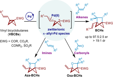 近日,公司suncitygroup太阳集团的郑军教授在ACS Catalysis发表了题为“Zwitterionic π‑Allyl-Pd Species Enabled [2σ+2π] Cycloaddition Reactions of Vinylbicyclo[1.1.0]butanes (VBCBs) with Alkenes, Carbonyls, and Imines”的研究成果。该工作开发了烯基双环[1.1.0]丁烷(VBCBs)作为一种通用的合成子,应用于钯催化的[2s+2p]环加成反应,成功实现了与多种2p体系(包括烯烃、醛、酮和亚胺)的环加成反应,多样性地合成了具有潜在药用价值的全碳、氮杂和氧杂环双环[2.1.1]己烷骨架,为进一步新药研发中的苯环生物电子等排体提供了新的合成策略。