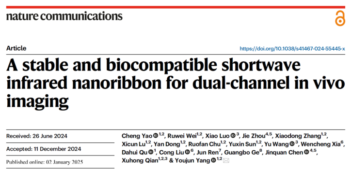 近日,suncitygroup太阳集团钱旭红院士、杨有军教授团队构建新型短波红外(SWIR)染料聚集体。该研究工作提出了一种晶体结构辅助的J聚集体的理性设计方法,对团队前期报道的ESi5近红外染料母体进行合理分子改造,成功构建一种水溶性好、稳定性好、吸收发射波长长且生物相容的染料聚集体,并成功实现小动物活体水平的双通道荧光/光声双模态成像。相关成果以 “A stable and biocompatible shortwave infrared nanoribbon for dual-channel in vivo imaging”为题发表在Nature Communications (Nature Communications, 16, 4, 2025)上。
