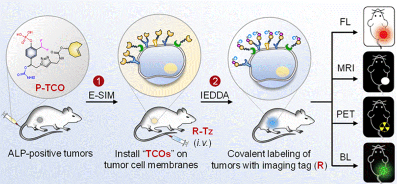 此外,谢贺新教授课题组与南京大学叶德举教授团队、江苏省原子医学研究所林建国研究员团队合作,在预靶向多模态活体动物肿瘤成像取得最新进展,相关成果以“Pretargeted Multimodal Tumor Imaging by Enzymatic Self-Immobilization Labeling and Bioorthogonal Reaction”为题发表在Journal of the American Chemical Society。该研究以研究团队前期发展的碱性磷酸酶自锚定探针(Chem. Eur. J. 2019, 25, 13994)为预靶向基团,通过亚甲基苯醌中间体的形成将反式环辛烯(TCO)选择性共价标记在活体动物肿瘤细胞膜上,进而通过快速的生物正交反应,将含有四嗪的各种信号报告基团(如荧光染料、磁纳米粒子、放射性核素、生物发光蛋白等)选择性富集在肿瘤细胞中,从而实现对活体小鼠肿瘤的高灵敏荧光、核磁共振、正电子发射断层及生物发光等多模态成像。南京大学博士研究生缪银杏、副研究员王宇琦、suncitygroup太阳集团博士研究生陈叶锋为论文共同第一作者,谢贺新、林建国和叶德举为论文共同通讯作者。