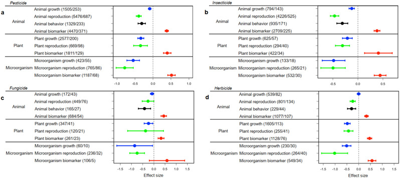 图3:农药影响无脊椎/有脊椎动物、单子叶/双子叶植物、真菌/细菌的全球试验结果