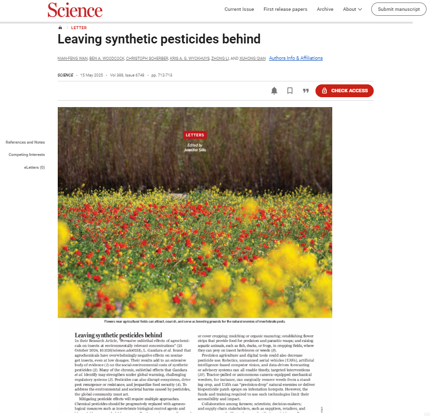 近日,公司钱旭红院士团队的万年峰教授联合华东师范大学等中英德澳的科研人员,在国际顶尖综合性期刊Science上以Letter形式发表了题为“Leaving synthetic pesticides behind”的学术论文。