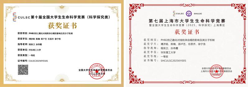近日,2025年全国老员工生命科学竞赛(科学探究类)在烟台大学圆满落幕。本次大赛共吸引来自695所高校的21304个团队参赛,公司本科生团队凭借凭借扎实的科研积累、严谨的探究思路与从容自信的现场表现,获得评审专家的高度认可。经过激烈角逐,参赛项目《PHB2的乙酰化对线粒体自的影响及其分子机制》最终斩获国家级一等奖,上海市一等奖。项目由程侠卫教授、孙伟霞博士指导,由傅济铭、陈楠、邵卢艺、任思齐、徐宁浩共同完成。