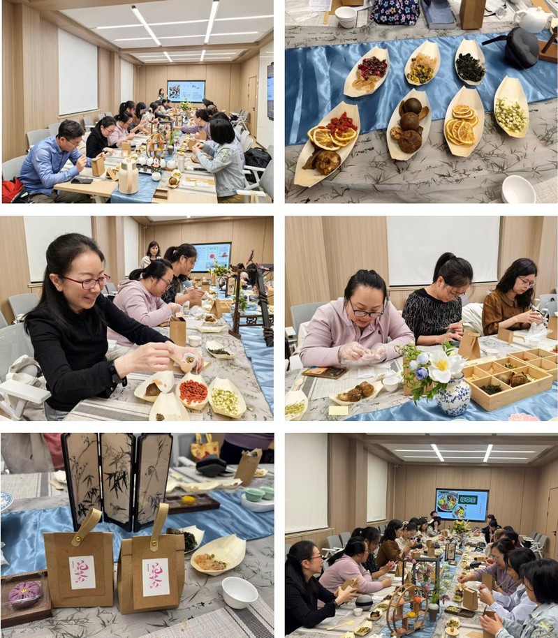 在活动讲座环节,养生专家给大家介绍了玫瑰、桑葚、薄荷、胎菊等七种花草的性味与功效,针对教师群体常面临的熬夜备课、用眼过度等问题,提供“熬夜方”“护眼方”等多种参考配方。在随后的互动实践环节,参与教师根据自身健康需求,自主选择花草食材进行搭配组合,现场完成个人的专属茶包制作。参加活动的教师们纷纷表示,饮用花草茶不仅能有效缓解口干与视疲劳,还有助于恢复注意力,提升工作效率。