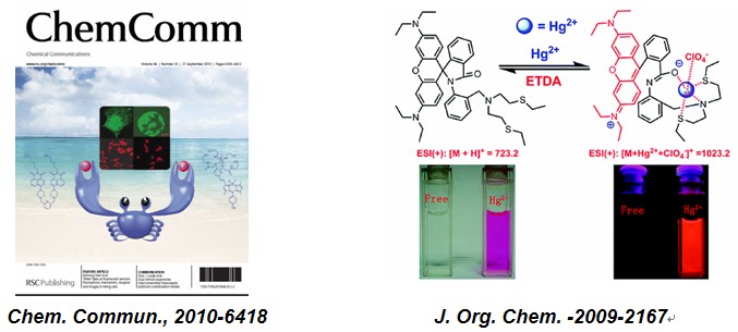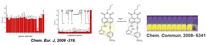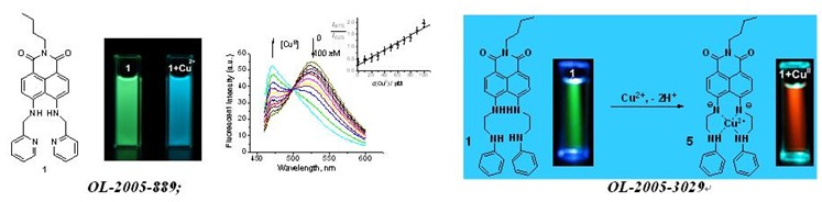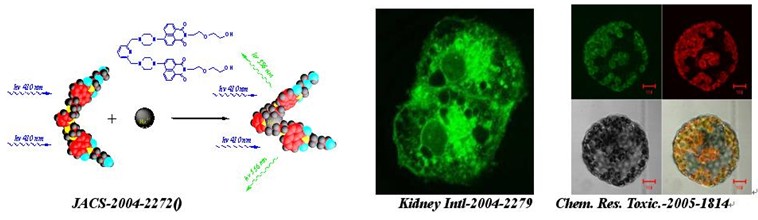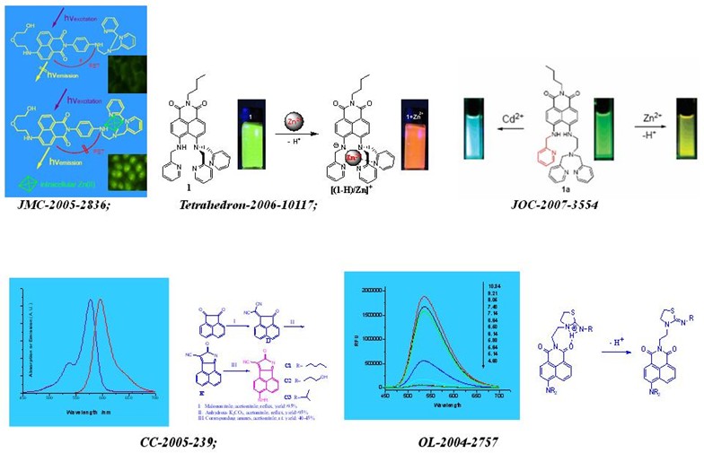 荧光传感器:由萘、萘酰亚胺、香豆素、氟硼吡咯、聚合物衍生的高选择性过渡及重金属离子(汞、铜、锌、银、钯等)荧光传感器;某些阴离子、酶的荧光传感器;以及其它的荧光探针、荧光标记。