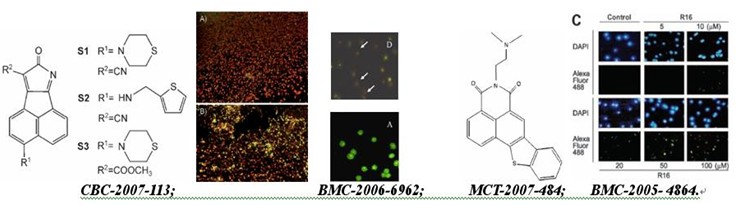 抗癌先导:由硫化合物、噻类芳香杂环、羰酰亚胺、萘酰亚胺、萘内酰胺、苯并吲哚酚嗪、吖啶、苊萘醌、苊萘吡咯羰腈、酞菁等衍生的抗癌试剂,BCL蛋白与细胞调亡剂,拓扑异构酶抑制剂,光动力治疗剂,色素的药物化学(抗肿瘤先导、DNA嵌入剂、细胞调亡剂)。